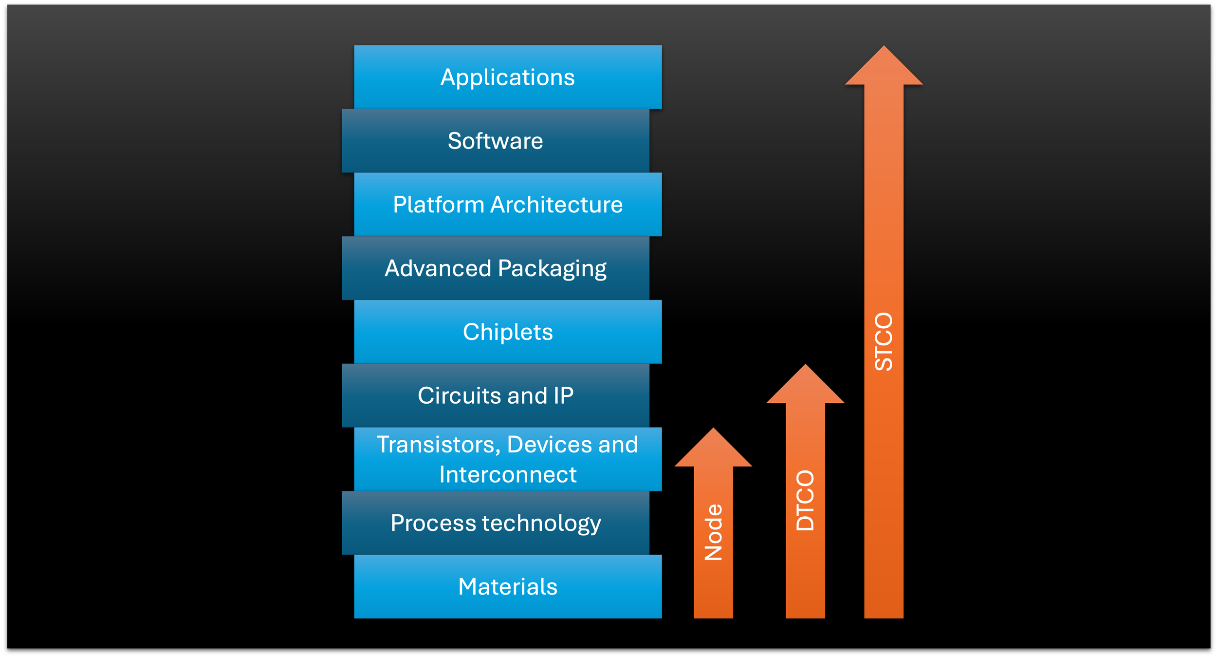 System Technology Co-Optimization (STCO) is best understood as a layered hierarchy where each level of abstraction, from materials to applications, influences and is influenced by the others. Below is a breakdown of the key layers in the STCO stack, each representing a critical opportunity for optimization and cross-domain collaboration: